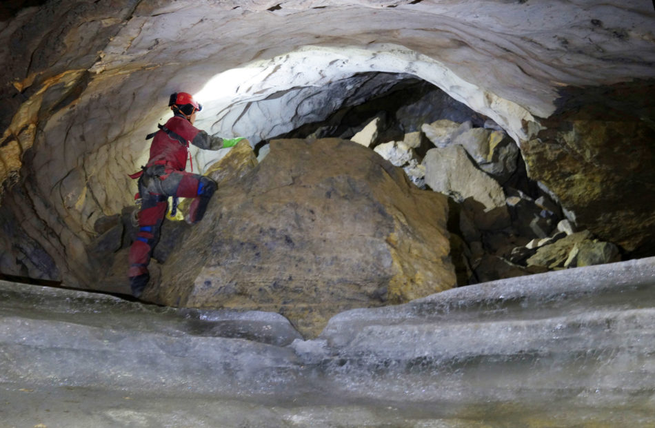 Dans la grotte de la Rivière Glacée, nous avons enfin pu passer le bouchon de glace qui s’était formé après les premières explorations des années 1970, et topographier avec un peu plus de détail les courtes galeries faisant suite à ce bouchon. Une trouvaille insolite, pourtant: dans un des diverticules au-delà du bouchon de glace, nous avons trouvé des morceaux de charbon de bois dont la disposition indique clairement un ancien foyer. Mais il est bien sûr exclu que des préhistoriques aient eu l’idée saugrenue de faire du feu dans une cavité glacée et sans aucun arbre ou buisson à des kilomètres à la ronde! Les auteurs de ce feu et le but de celui-ci demeurent toutefois inconnus.