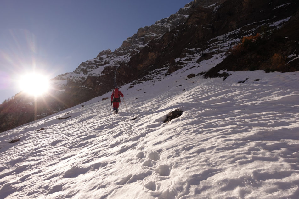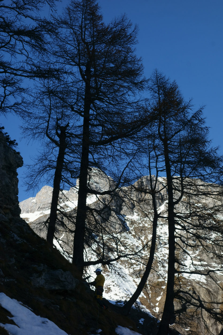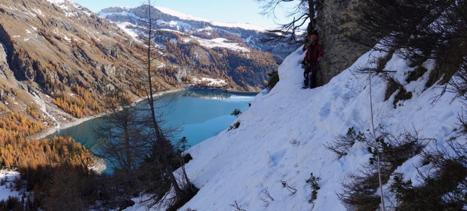 Manque de pot, il nous manque une trentaine de mètres pour rejoindre l’entrée. Cette sortie nous aura malgré tout permis de reconnaître l’accès, de connaître la longueur de corde nécessaire et de profiter d’une magnifique journée au-dessus des mélèzes jaune d’or.