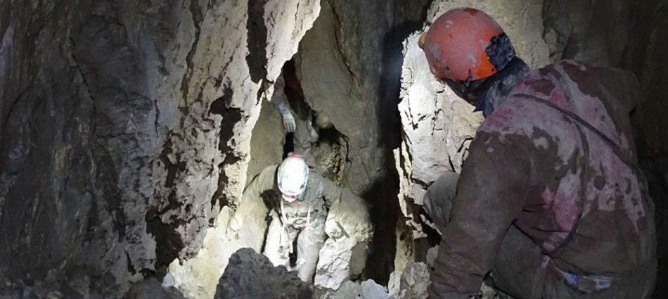 On avait déjà opté pour une stratégie à deux équipes : l’une part devant équiper, pendant que l’autre suit en topographiant directement. Florian et Sabrina partent équiper pendant qu’Amandine et Miguel suivent avec la topo. Comme l’équipe de pointe bute rapidement sur une escalade à équiper, l’autre en profite pour explo-topographier une galerie partant vers le bas. Celle-ci nous mène, après un court crapahutage et un petit ressaut étroit, dans une salle terminale où un filet d’eau se perd dans le comblement encore non dégagé. Amandine repère une chauve-souris en hibernation dans la salle – la première hibernante observée aussi haut dans le Lapi di Bou. D’après ce qu’on a pu voir, elle ressemble à un Murin à moustaches/de Brandt. Par opposition à la Galerie Ronflante et à la Galerie du « Bip », nous l’appellerons la Galerie Silencieuse.