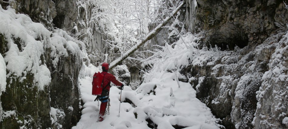 Après le froid de la veille, les chauves-souris ont dû rejoindre leurs quartiers d’hiver à coup sûr. On en a donc profité, ce dimanche, pour aller voir quelles espèces se sont installées à la Combe Barathoux, où un comptage avait été fait cet automne lors du swarming. Compte tenu de la qualité des spits du P20 (7 spits plus rouillés les uns que les autres!), on s’est arrêté là en se disant qu’on allait revenir avec une perceuse pour mettre des goujons inox. Jusque-là, on a repéré trois chauve-souris en hibernation, qu’on a pris grand soin de ne pas déranger. Un coin magnifique sous la première neige!