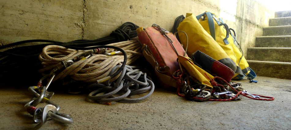 Le matériel prêt à partir le jeudi matin. Deux kits de cordes, les autres s’installant à rapidement depuis l’entrée, deux légers nourriture et boissons, et évidemment la perforatrice.