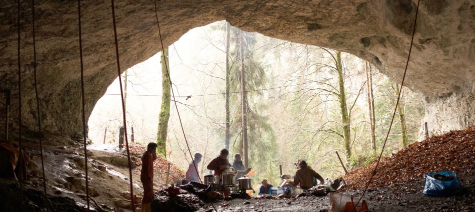 Non, ce ne sont pas des lianes, et non, ce n’est pas une soupe populaire. Pour cette journée d’initiation à la spéléo destinée à des étudiants de l’EPFL et de l’UNIL, le SCVJ a installé toute une série de cordes ainsi que deux tyroliennes dans la salle d’entrée de la grotte, pour les exercices techniques. Sans oublier une cantine bien fournie, avec soupe chaude, pain et fromage, pour sustenter tout ce petit monde. La visite de la cavité s’est faite par petits groupes jusqu’aux environs du Lac des Fruits Défendus, en passant par la Salle des Miroirs. Une belle expérience pour tous!