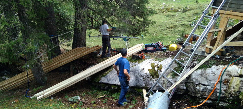 La fête des 30 ans approchant, il a fallut finir quelques travaux. C’est-à-dire : ajouter une couche à la face nord de la cabane, finir le revêtement intérieur du toit, couper du bois de chauffe et j’en passe. Le changement de certaines parties de la partie inférieure de la structure avait déjà été effectué au début de l’été.