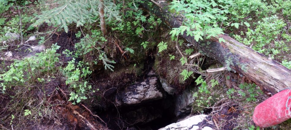La pose pic-nique vite avalée, Raphaël, une de nos jeune recrue, court les alentours de notre chantier en cours. On se fera vite héler…. eh les gars, vous avez vu ça!? Ben non, et Denis se relève pour zieuter l’histoire tandis que je retourne faire quelques tic-boum dans le Croassement. Personne ne m’a rejoint, job effectué pour moi, je me ressors. Mes deux acolytes on pris les bidons et sont 40m plus loin déjà entrain de désober! Pis alors? Ben on a tiré quelques cailloux et bidons et y’a du vide là derrière. Raphael se faufile déjà sur 2-3m mais c’est des gros blocs coincés pas très stables. Mais le laser donne déjà plus de 6m. Faudra revoir cela avec du matériel plus adéquat pour enlever ces blocs.