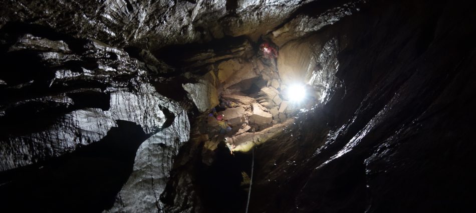 Et c’est pas fini au bas de ce superbe puits! Pendant que les 2 topos poursuivent leurs relevés, Léo et moi poursuivons en utilisant au max la longueur de la corde et son élasticité pour descendre un ressaut d’environ 8m et en désescalade une fois la corde lachée!