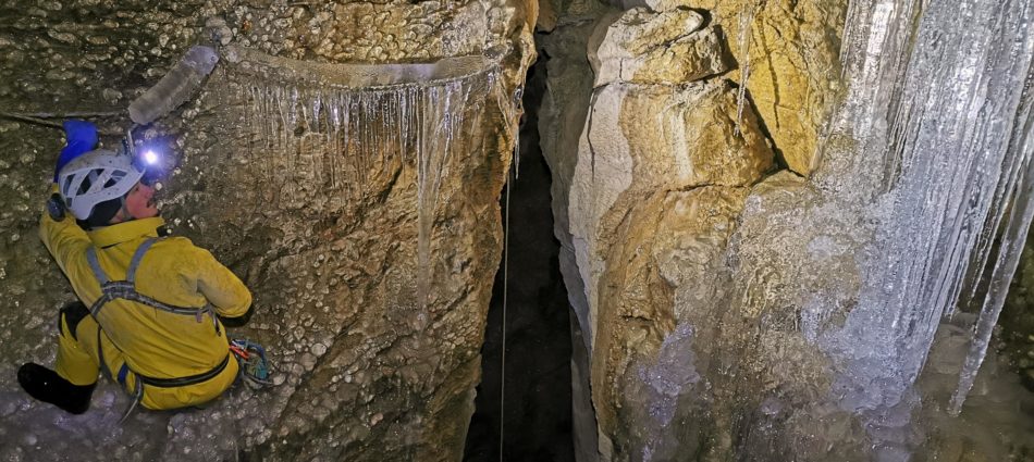 Cette fois, nous relisons bien les descriptions disponibles dans différentes revues de spéléologie. Nous réalisons enfin que nous n’allions pas dans le bon réseau ! Pour cette grosse expé, Benjamin et moi préparons les (très chargées) pulkas au local du club. Environ 150m de cordes seront nécessaires à cette expédition. Avec tout notre ravitaillement nous finissons par trainer 110kg (divisés non équitablement en 65-45). Lors de notre trajet, nous râlons face aux aléas de cette fin d’hiver car nous rencontrons mauvaise neige, boue, racines et soleil tapant… Nous arrivons tout de même à la cabane après deux heures de tirage ! Notre acolyte combiers, Paul, arrive, plus léger, en même temps. Après le pique-nique, nous partons à la glacière avec les premières cordes pour le rééquipement. Avant de commencer nos objectifs, nous passons beaucoup de temps à libérer les cordes qui sont prises dans la glace… Arrivés au puits Suprême, nous devons l’équiper de manière à éviter la chute d’eau qui en traverse le puits. Deux déviations acrobatiques nous permettent de passer par une partie plus sèche. C’est donc plus de deux heures plus tard que nous commençons notre premier objectif : rééquiper le réseau Bosch, qui permettra un accès sec vers le bivouac. Nous poursuivons et terminons l’équipement de ce réseau samedi. Dimanche nous nous rendons au puits du Monocle pour déséquiper les cordes posées par erreur et nous les récupérons pour la suite de l’équipement. Nous nous rendons enfin dans le tant désiré Réseau Président où nous nous arrêtons au méandre vers -280m. Nous programmons la fin de l’équipement pour bientôt !