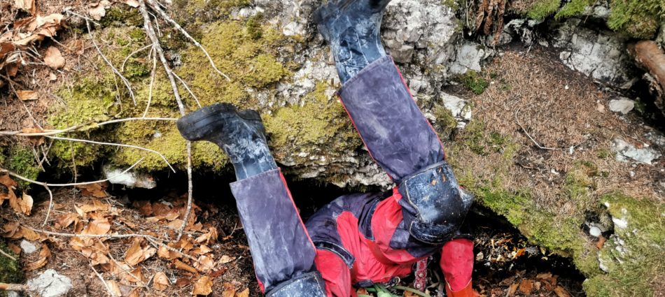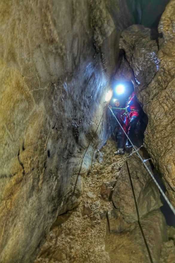 Deux semaines plus tôt, Benjamin, Johann et Oriane font un faux départ dans cette même cavité suite aux instructions erronées basées sur de vieux souvenirs d’Oriane… “non non, ne prenons pas de vis, c’est ‘oldschool’, on a tout rééquipé en goujons la dernière fois”, eh bien non ! Si quelques goujons ont été placés en 2015 pour remplacer de vielles vis, tous les premiers puits sont bels et bien équipés de spits. Cette journée-visite s’est alors abrégée et transformée en exercices de nœuds et pique-nique dans l’entrée de la cavité. Point final avec une fondue au local, bien évidemment.