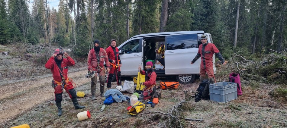 Cyril et moi – probablement par réaction à la superposition d’objectifs – avions proposé 7h00 comme horaire de rencontre. Une sorte de test pour nos chers néophytes ? Bon, il faut l’avouer, tous deux avons un peu triché en dormant sur place avec nos vans aménagés respectifs. Louis, Mathias, Thomas et Ludovic nous ont donc rejoint – Jules, Cyril et moi – au doux moment du déjeuner, dans le van chauffé de Cyril. Premier ou deuxième service de tartines : nous nous régalons joyeusement. C’est aussi le moment des photos absurdes et des présentations. Oui, “l’initaition – perfectionnement” c’est aussi l’occasion de se faire conter des histoires de spéléo (comme les récits de gastro souterraine ou de rendez-vous manqués pour cause de TPST démesuré). Ces nouveaux ont par ailleurs l’honneur de commencer leur ascension caverneuse dans le van du Chef de la colonne de secours, ce n’est pas rien !