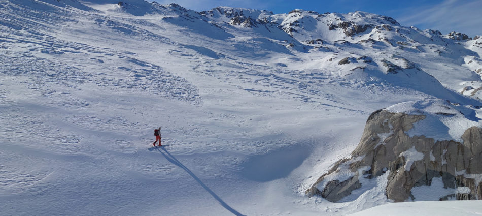 La meilleure saison pour repérer les trous souffleurs est quelque part entre mi-janvier et fin février, lorsque la couverture neigeuse est déjà suffisamment épaisse pour que seuls les trous souffleurs les plus puissants continuent de percer (et pas toutes les fissures de lapiaz), mais avant que des tempêtes de Foehn relativement “chaudes” bouchent tout. Ce samedi, l’enneigement est entre 30 et 60 % de la normale pour la saison, selon les cartes du site SLF, et donc assez idéal pour notre objectif (moins pour le remplissage des barrages, ce printemps…).