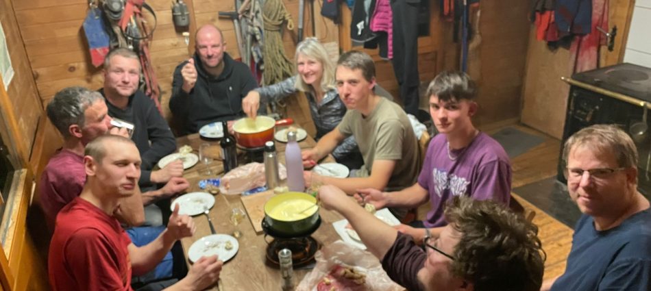 Avec David je monte directement à la cabane pour 17h00, Albert nous y attend déjà et à même commencé à travailler. On attend le reste de l’équipe, qui sont allés visiter la nouvelle grotte du Bucley, pour manger la fondue. Je vais pas nommer tout le monde, je risque d’en louper, et en plus, certains étaient à la fondue mais pas au Bucley et certain au Bucley mais pas à la fondue.